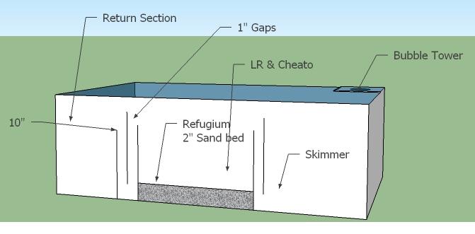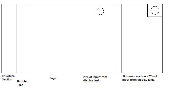 Hi All, About four weeks into my son's reef build we ran across a used 35G aquarium for $20! So of course we bought it and went to work building a fuge (prior to finding this site). Seems to have made a huge difference in the tank chem... but we are still getting some micro bubbles in the display tank. Wondering if anyone has any wisdom for us? I think it is running about 500gph.... the drawings are below (not to scale): ...