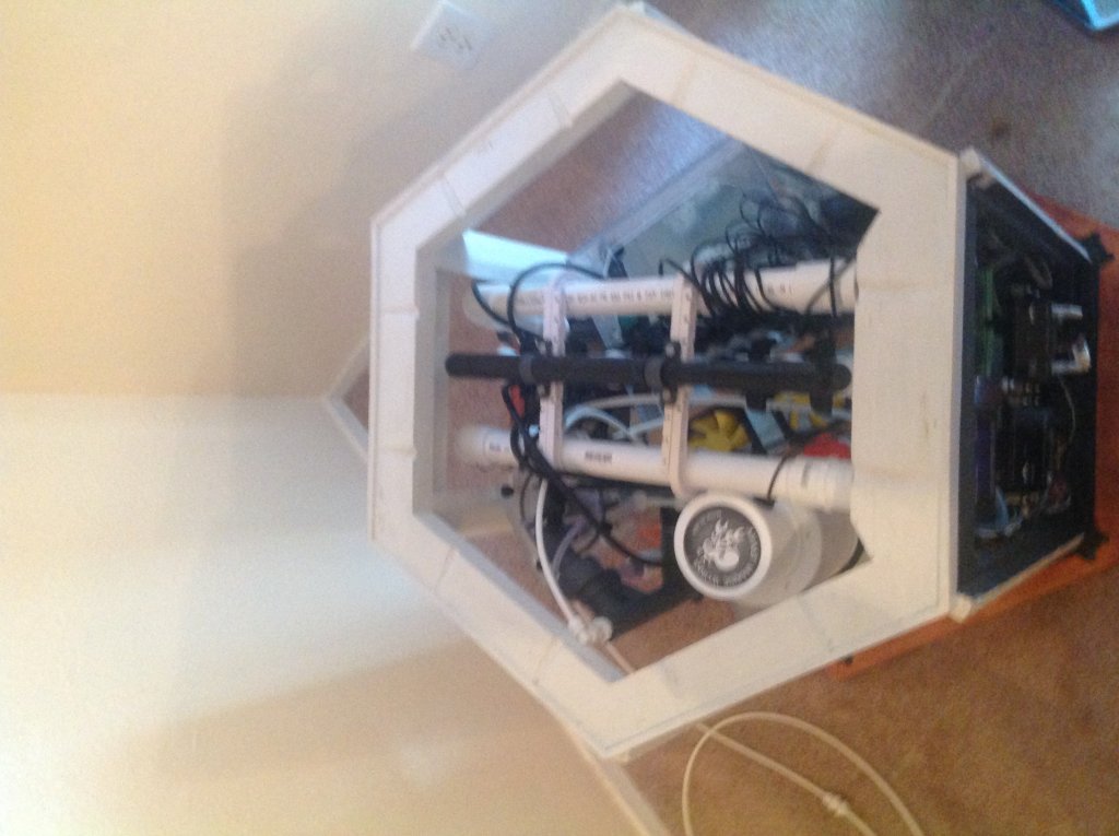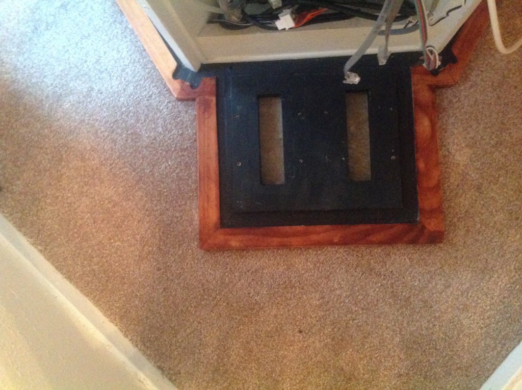 The first photo is of the top outer frame assembly complete(top view). Around the white area is trim with the top at a 15 degree down angle to keep any splashed water in the white area. The back cover also has matching trim that ovelaps this trim so any water that is dripping down the side of the back cover will remain in the white area. The second photo of the top frame assembly complete(bottom view) shows the router pattern to allow the frame to cover the top of the side panels and back cabinet ...
