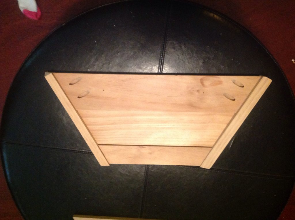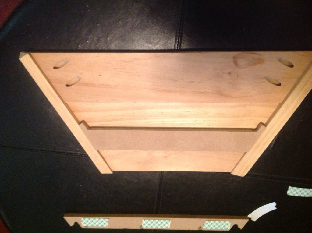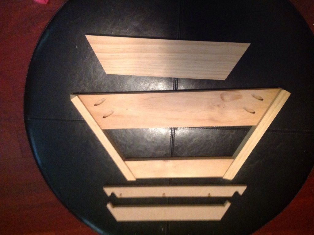 In case some of you are intrested in how I made the outer frames I posted some photos of the devices used. These were made from scrap wood and MDF. I made 2 templates out of MDF. I also made a frame out of wood to help in placing the templates down onto the part that needs the 1/4" pattern cut into it. The top part in the first photo is a section of wood that needs the pattern cut into it. The two parts at the bottom are the actual templates. In the second photo the section has been placed ...