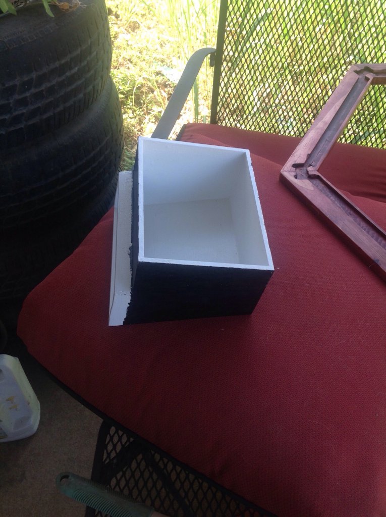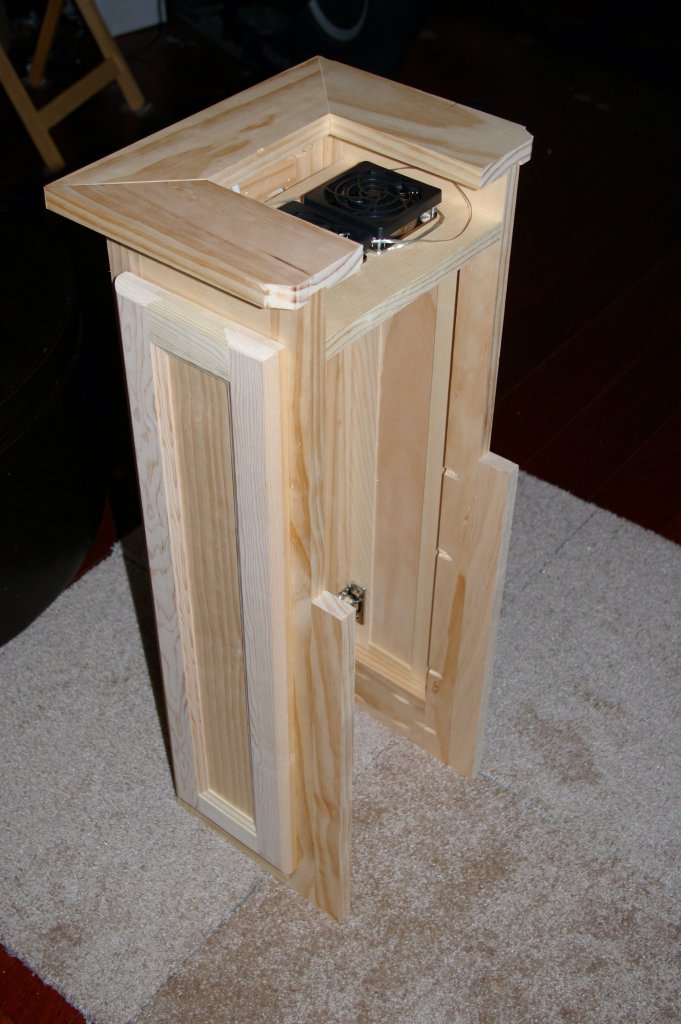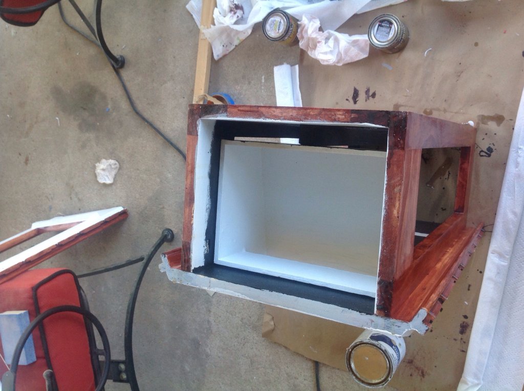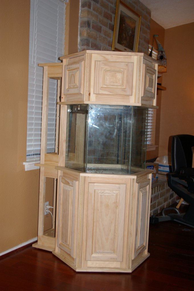 The first 2 photos are of the diverter used to channel any water spilled at the back of the tank to the stand. The third photo is of the diverter in place without the trim around the top. this view is from the top of the cabinet. The forth photo is from the top with the trim glued in place. The top outer frame assembly also has trim in place to channel the spilled water into this diverter. The last photo is a view from the stand side of the back cabinet. Please excuse it being sideways. I tried ...