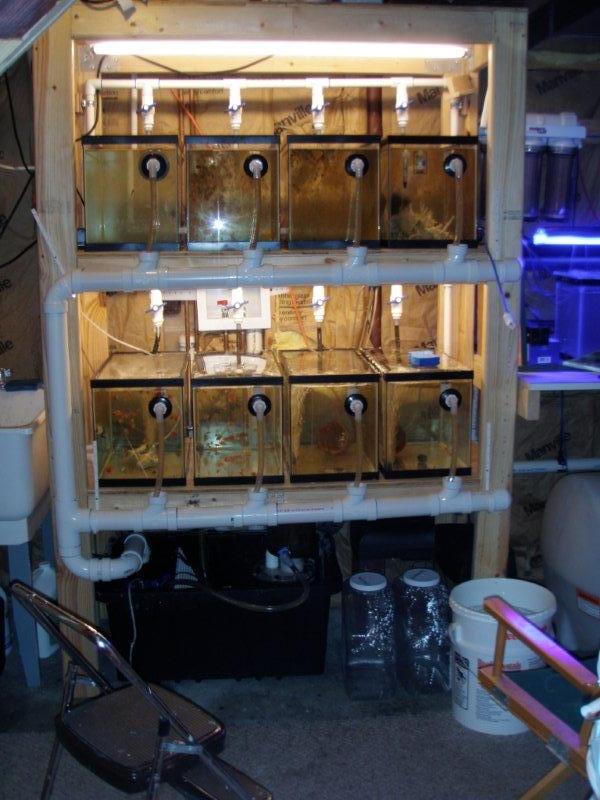 Tanks: (8) 10 Gallon Aqueon tanks (drilled with 1 inch thread x thread bulkheads)
