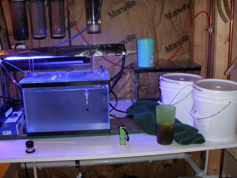 I thought I would start off with the Breeding Room. The space I used for it is lcoated in my basement. There is a small room down there which houses my central air conditioning. The previous owners of the house had a laundry room in this spot. The good news for me is direct access to water, the room was outfitted with a stationary wash basin, hot and cold running water and a drain right in the concrete floor (a blessing for any reefer). Over a period of 6 months it has been transformed from a waste of space to my most favorite place in the house.