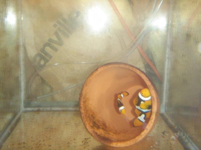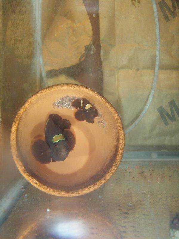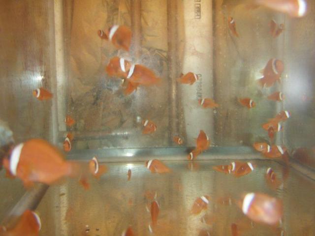 I started with Tomato Clowns which are housed in my main SPS reef. The eggs, at the top, in the first picture were literally the first eggs I had ever seen and were the first fish I attempted to raise. After much frustration, long hours, and love, I finally got the knack for them. It has sort of blossomed out from there. I have been very fortunate to have hooked up with some great pairs of fish from good folks on RC. I have a spawning pair of Percula clowns who, albeit young, have produced two egg batches of which none have survived past three weeks, still much to learn from species to species. My current attentions are being directed at a pair of Gold Striped Maroon clownfish. Still learning the in's and out's of this particular species. I have 7 fish from their first hatch at 3 weeks of age and another 250 going on their fourth day. I am participating in the breeders challenges sponsored my MOFIB.org and this years choices include: Firefish, Dragonfaced Pipefish, Banggai Cardinal's (not pictured) and Peppermint Shrimp, so they are currently being conditioned for breeding as well.