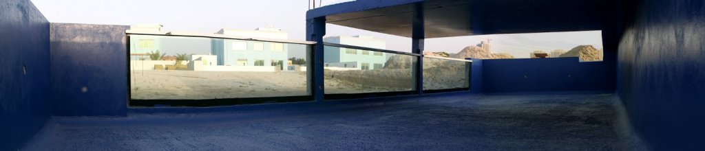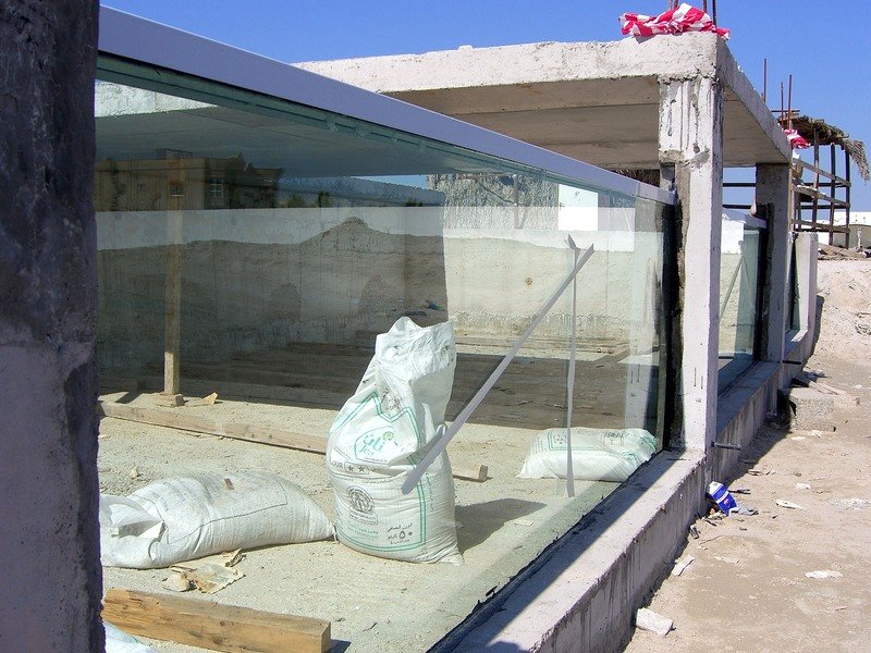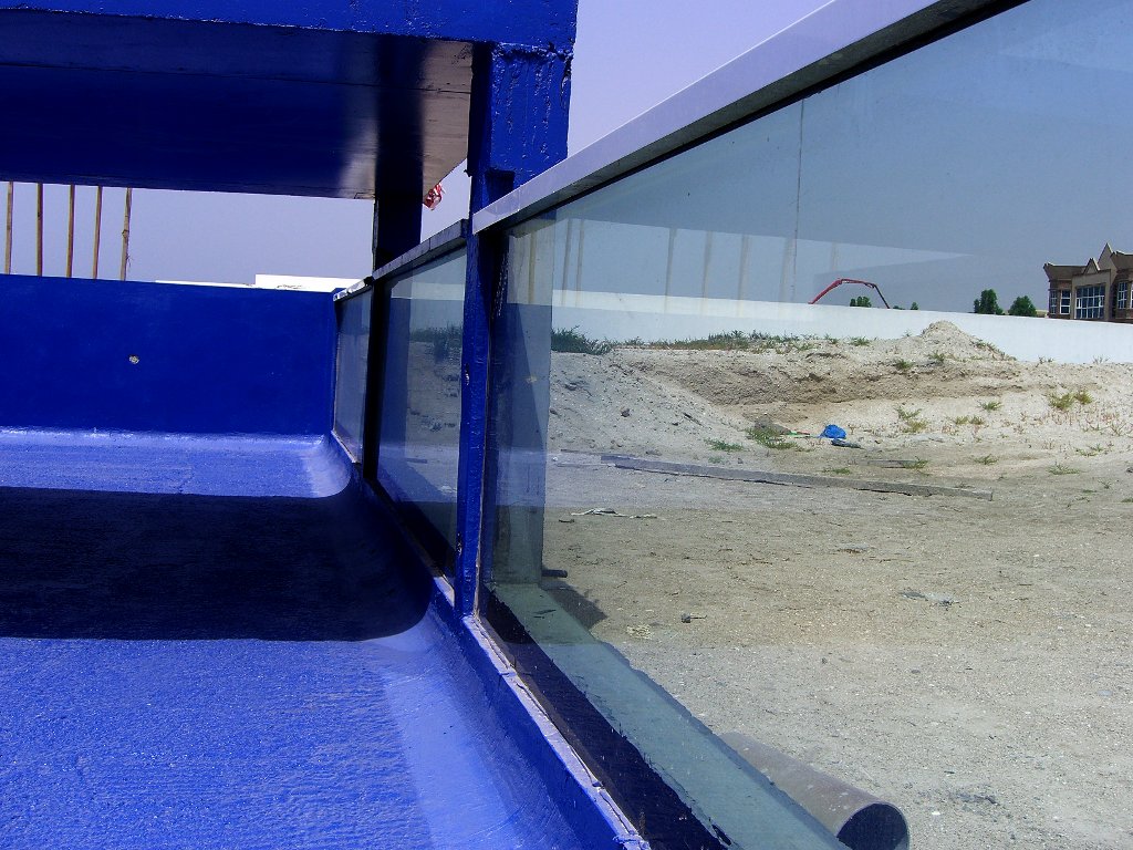 The aquarium has three-sides and the floor made of marine-grade reinforced concrete. The fourth side is made of glass. There are a total of three pieces of glass measuring ~3m each. The glass is made of two sheets (12 mm + 12mm thickness). Both sheets are laminated, tempered, and polished. The top of the glass is reinforced by a horizontal beam made up of three sheets of glass. The top part is covered with stainless steel.