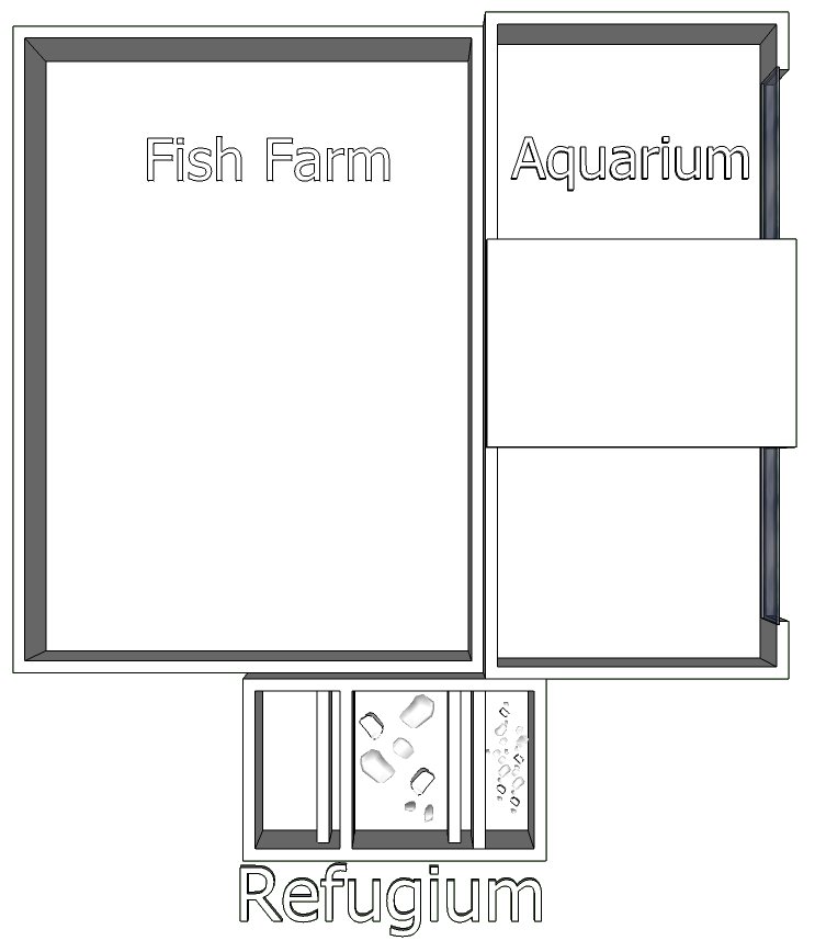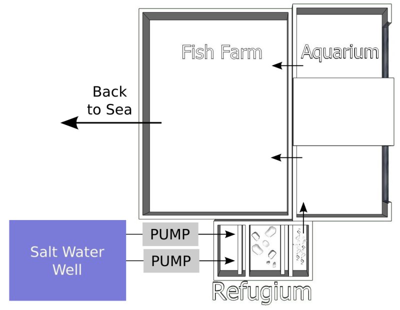 So as we stand now, the saltwater will be pumped from the saltwater well into the refugium and then into the main display area. After that, the water will overflow into the fish farm and then finally to the sea. The total water volume is around 45,500-gallons: