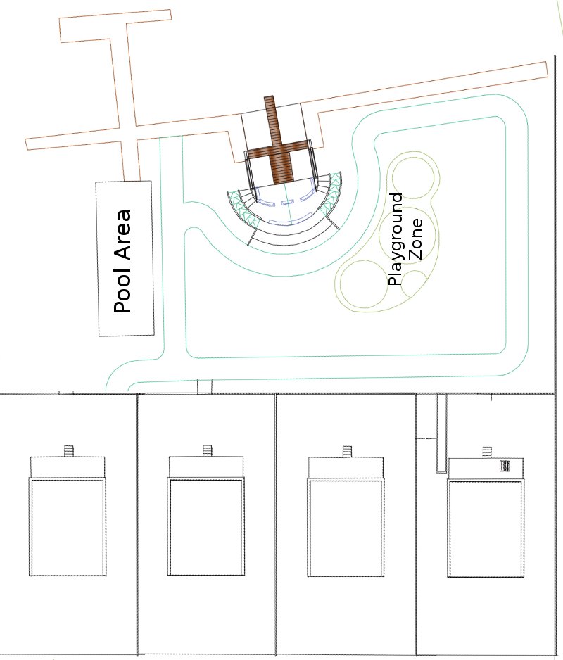 We started with a simple sketch of what we needed and how we could connect everything together. The first design was a representation of that. It used simple passageways to connect the villas together and to the focal areas of the 'backyard.'