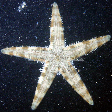 The Sand Sifting Sea Star, at first glance, seems to be drably colored like most bottom dwellers. But closer inspection reveals a striking beauty and serenity to the alternating bands of brown and beige that dress this invertebrate's thick, spine-covered arms. Like other starfish, Astropecten polycanthus efficiently consumes mass amounts of detritus and uneaten foods. This nocturnally active member of the Astropectinidae family can move large amounts of sand as it burrows into the substrate in its search for food. This peaceful omnivore will effectively clean even the largest home aquarium of detritus and left over food. Like other starfish, the Sand Sifting Sea Star will also consume small invertebrates, including shrimp, urchins, mollusks, bivalves, or other small sea stars. As such, the Sand Sifting Sea Star should be actively fed a varied diet consisting of natural food sources, especially in well-established marine aquariums. Otherwise, this voracious feeder will quickly clean your aquarium of detritus and then burrow into your substrate, starve, and eventually begin to decay.
