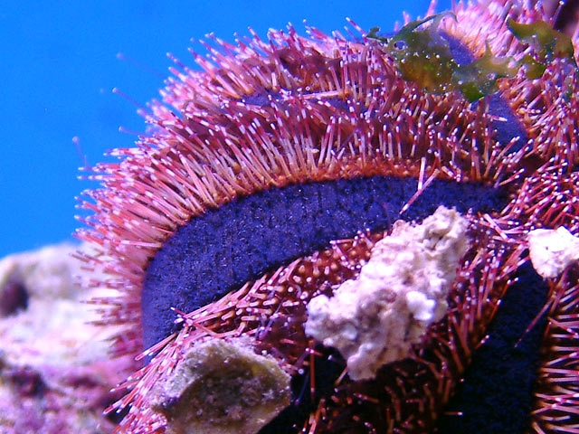 The diet may be supplemented with dried seaweed. Also, if you are OCD about your sand being clean like I am, be aware that this urchin can leave broken spines all over your sand floor.