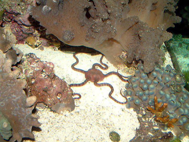 The Serpent Sea Star of the genus Ophioderma has a central, 5-sided disc with five banded, scaly arms. Depending upon the species and locale, the color can range from maroon, to orange, to green. The central disc can also have variable markings. It does well in an aquarium if provided with ample hiding places and plenty of room to roam. Even though it is a nocturnal animal, it will eventually learn to come out during the day to eat.