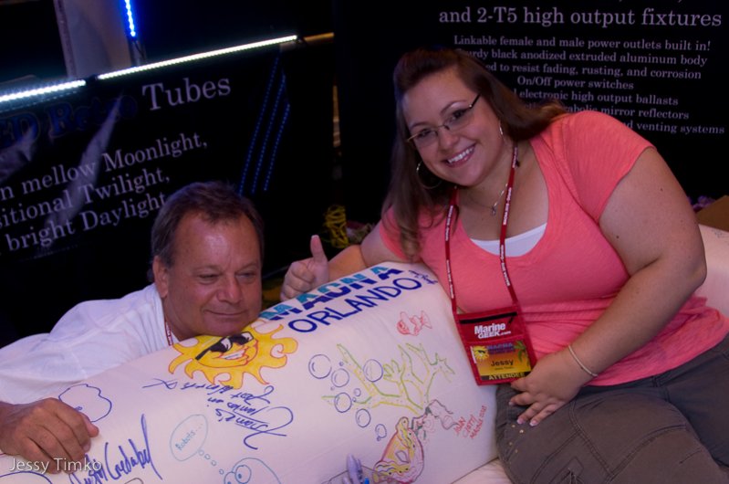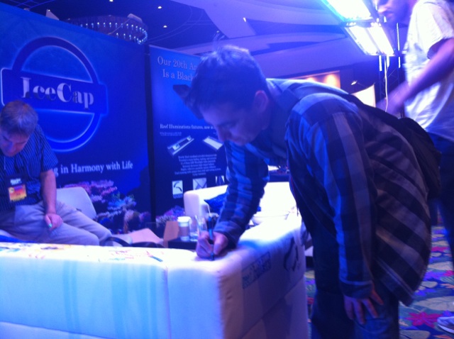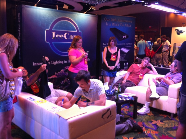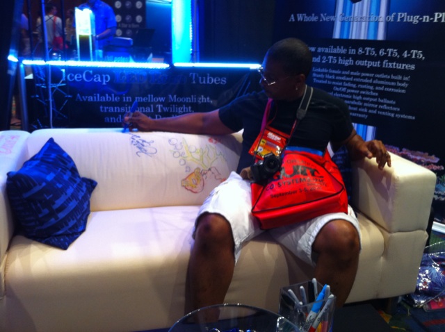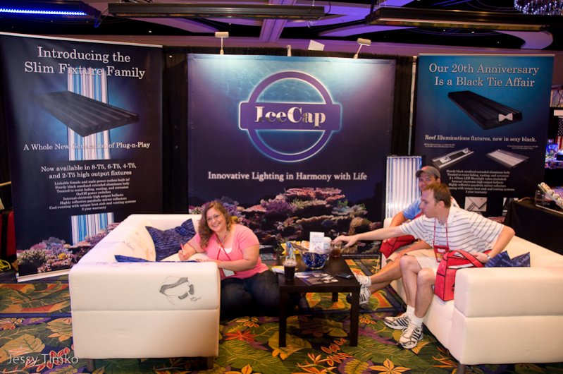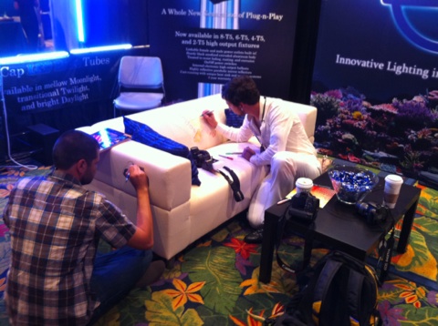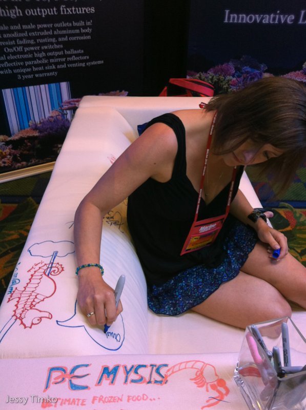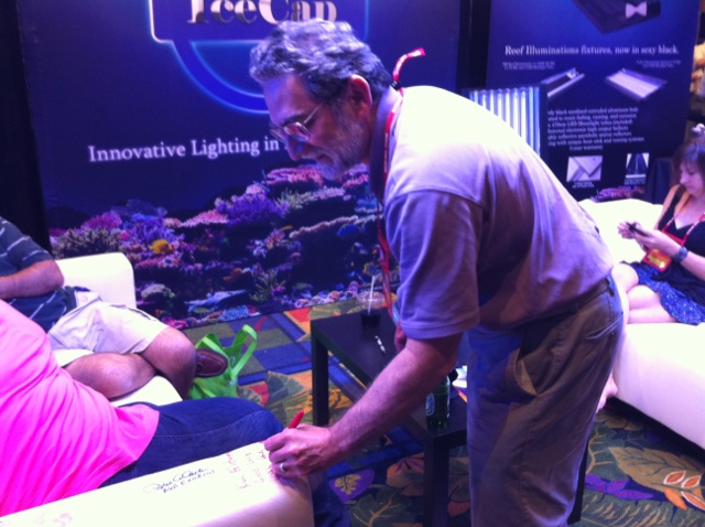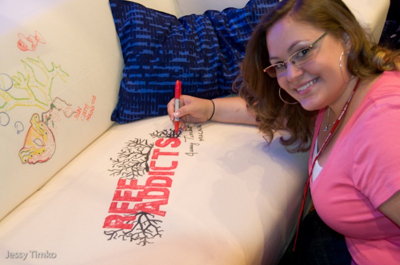 There were lots of great booths and designs at MACNA this year, but one of the ones that got the most buzz what IceCap's 20'x10' booth. Laura Birenbaum, (THE one and only hottie reefer'ette you always hear Marc and I refer to on the podcast) purchased a set of canvas covered couches from IKEA and supplied sharpies for speakers, sponsors, and VIP to sign during the show. Being the Reef Addicts supporter that she is, she let me tag the couch with a big ole' logo. The couch was a great idea both for memories and for marketing. Everyone had something to say about it, or wanted to know where they were going to go after the show. Last I heard, Laura was taking it home with her.