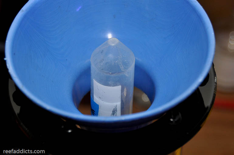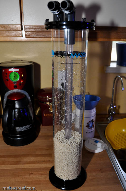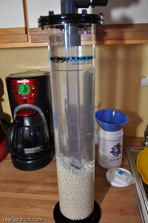 The pellets were soaked overnight, drained, and then poured into the reactor. Because I still had some from the previous batch, these were added as well. The new media is larger and heavier, thus the older media usually floats to the upper section. In these pictures, 1000ml worth of EcoBak filled the reactor less than halfway. It was filled with RO water prior to installing it in my sump.