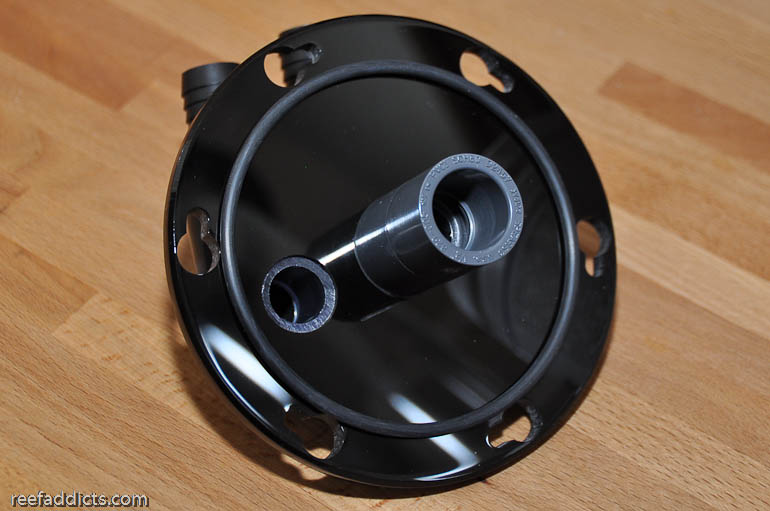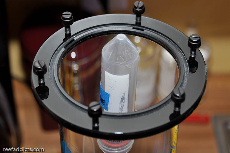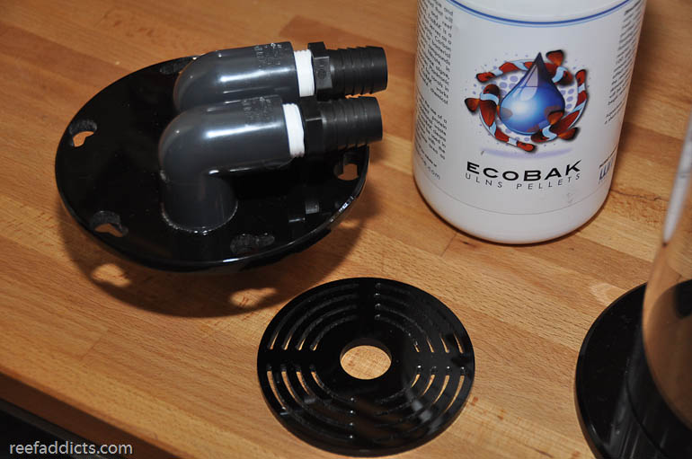 Within the chamber, an upper flow plate or screen keeps the pellets from flowing out of the reactor, especially if some of the float. The plate can be extracted with something thin, like a paper clip fashioned into a hook for example. Once this plate is out of the way, the reactor can be filled up with media. I've run three types of media in this reactor: Vertex, BioSpheres, and EcoBak pellets. None did better than the other brands, and all worked as advertised.