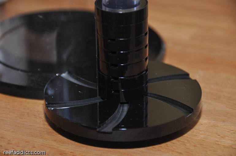 The bottom plate is screwed to the riser tube using two long plastic screws. Above that plate are a few stacked plastic parts that resemble fat washers, with a narrow slot traversing each one. The water pushes through these slots, creating that rotational flow that makes the beads spin.