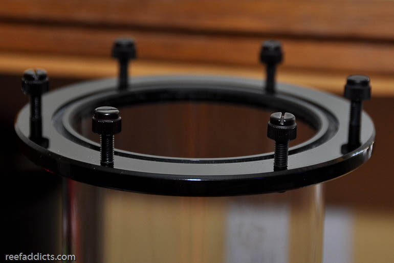 To open the reactor for cleaning, filling or refilling, there are a six plastic knurled slotted screws that fit keyhole slots. Using a flathead screwdriver, loosen the screws enough to rotate the lid half an inch, then lift it off. The screw heads aren't big enough to do this by hand, but once loosened you can back them out using your finger tips.