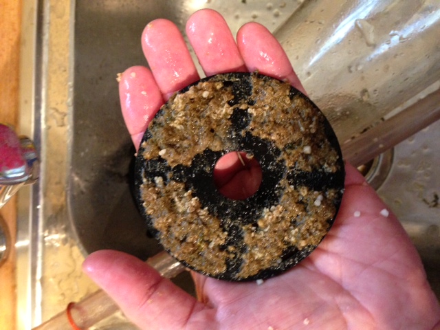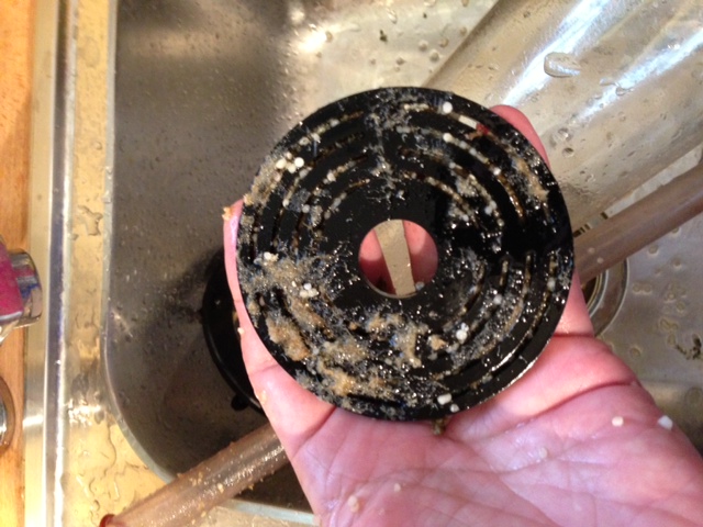 When running a biopellet reactor, often some type of brown fuzzy growth appears in certain spots, including the upper plate. This is more than likely caused by bacteria, since the collective mass doesn't settle at the base like detritus might do. About every five months, I'll open up the reactor to remove and clean that upper plate to prevent obstructed flow. That's a good time to add additional media to the reactor. If the entire unit looks like it could use a thorough cleaning, I'll pour the remaining pellets into a container with some saltwater, and then disassemble and wipe down the entire reactor in and out.