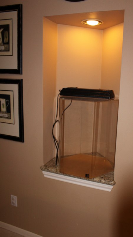 I had kept a 10 gallon freshwater tank for about 3 years, and decided to get a larger one. My brother told me about how cool his saltwater tank was while he was in college 20 years ago, and I decided to look into it. Meanwhile, my wife told me that instead of keeping the fish tank on the counter in the kictchen, that I ought to get a new one and put it in the art niche about 10 feet away. This was a nice spot, but was very central to the house. It would have to be done well, as it would be on display for anyone and everyone to see. Searching the internet, I found that a hex shaped tank of about 34 gallons would fit in that spot. Most I saw were discontinued, but I found a used one on craiglist for sale in Baton Rouge. I paid the guy, and he shipped the acrylic SeaClear brand tank to me and it made it just fine. First problem ! It was a bit too big....