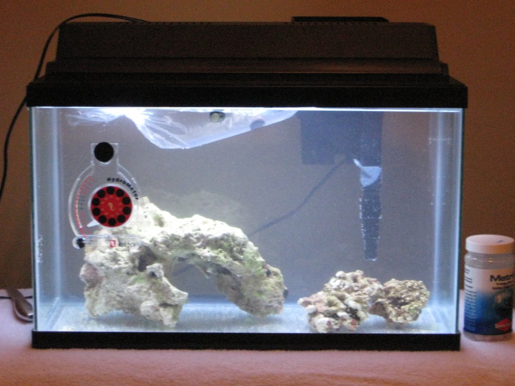 My dive into saltwater began with a FOWLR 10gal nightmare. Armed with nothing but the knowledge of the nitrogen cycle and stocking recommendations, I picked a "saltwater starter kit" some live rock and some sand and waited. I waited two whole weeks (not so good with the patience thing, better now) and dumped in two ocellaris clownfish and a green chromis. I was using a HOB filter and a normal output fluorescent algae lamp. I went thru countless additives and empty promises until I found Algone. I used this product for months with great success until I decided that I need a more economical way of filtering my water. I know, I'll just get a bigger tank which will help my stability!