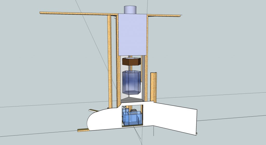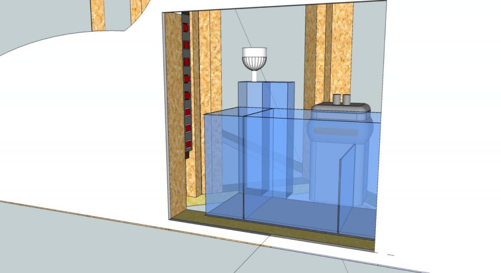 So, I couldn't cut into the wall and start building, but I could plan it out for the next few weeks. I had pictures from then they built my house, and I started to lay it out in autocad, but then I found out about google sketchup. Its a free 3d modeling program that I started to get into. I was able to measure stuff, model the wall studs, niche, and then my equipment. I started building it in sketchup, and postitioned things so that I could ensure that they would fit. I have modeled the sump (with mangrove plants in it), the skimmer, and the fluval 205. I have also modeled a nice 8 rocker switch power strip thing that should clean up the rat's nest of wires. I modeled the hex tank in the art niche and figured out that it would be a lot better if it was raised about a foot or so. This could make a nice place for a drawer to keep all of my fish junk in it. Test kits, food, and the like.