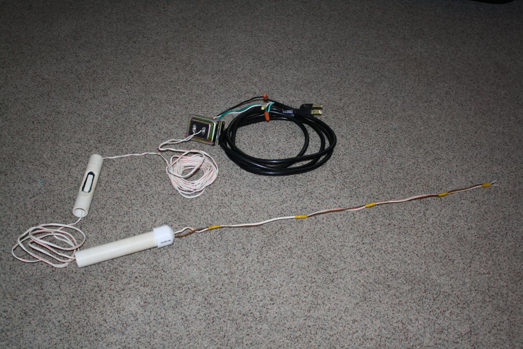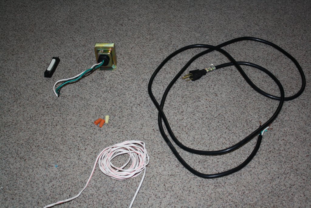 A door bell ballast, plastic doorbell, doorbell wire (18 guage wire), wire nuts, grounded electrical cord, electrical tape, metal coat hanger, two six inch lengths of 1/2" PVC pipe and one end cap. (Not all supplies shown)