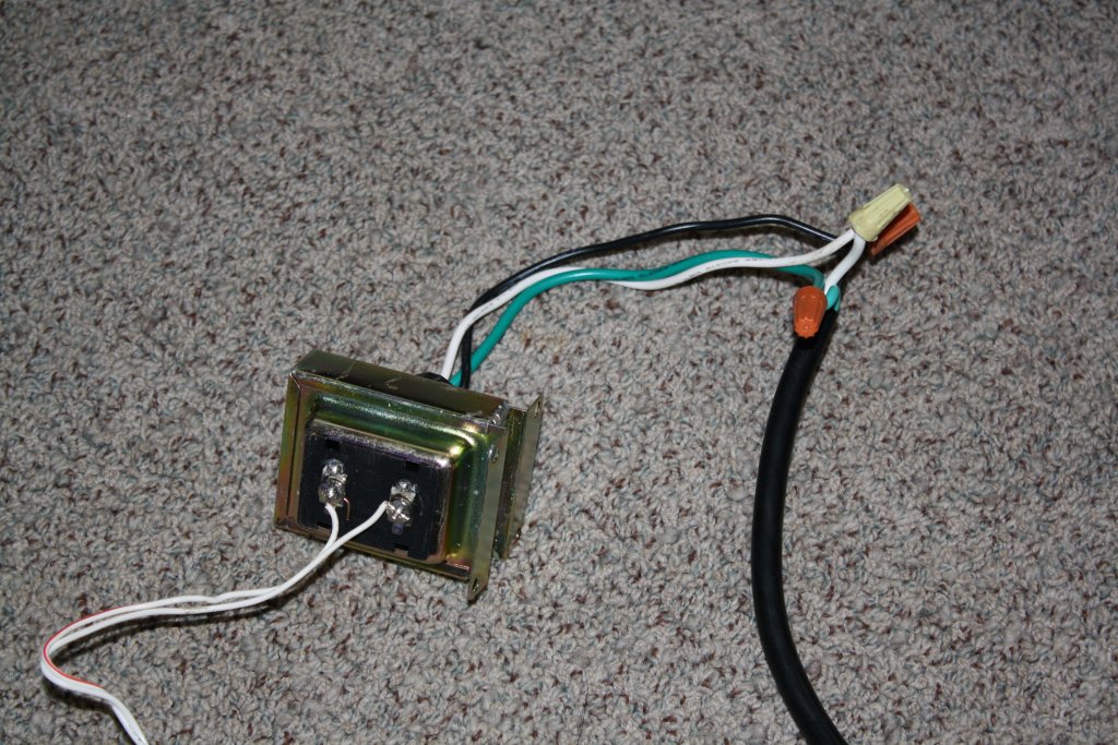 Next, use the wire nuts to attach the grounded cord to the ballast, match the colored wires to each other and twist them together with the wire nuts. Then strip the doorbell wire about 3/8 of an inch. Use the screws on the ballast to attach the wire. I covered the wire nuts with tape to help keep them from being pulled apart.