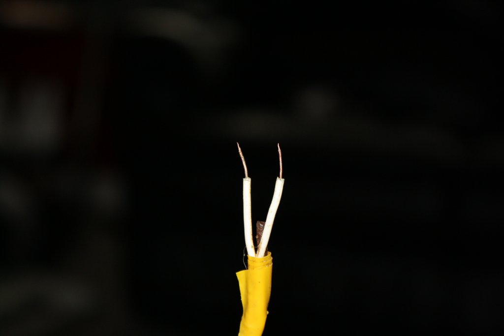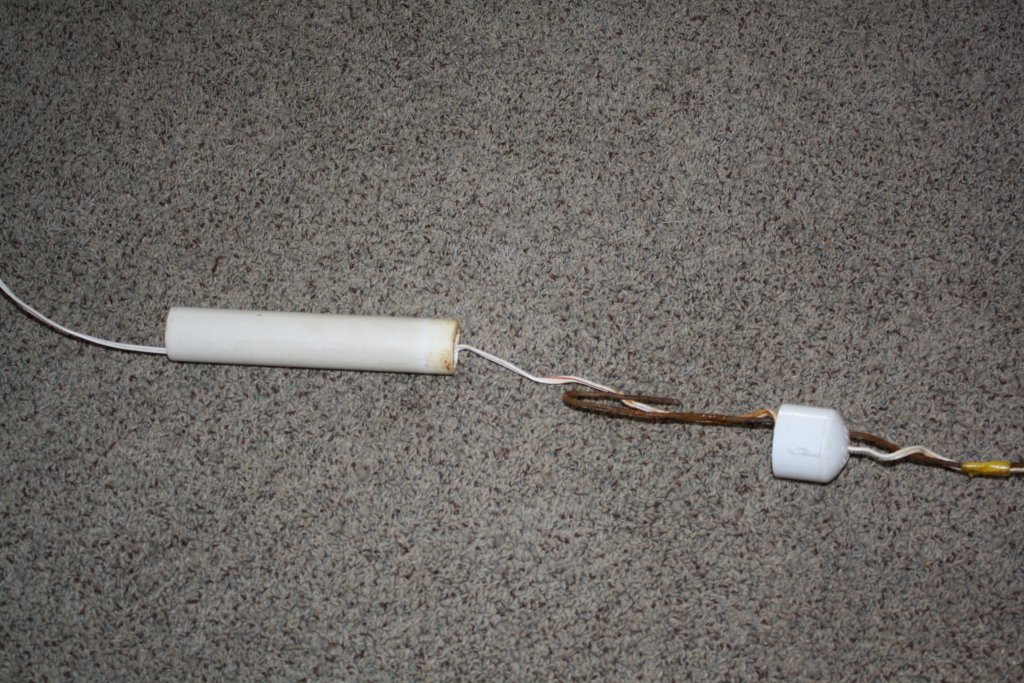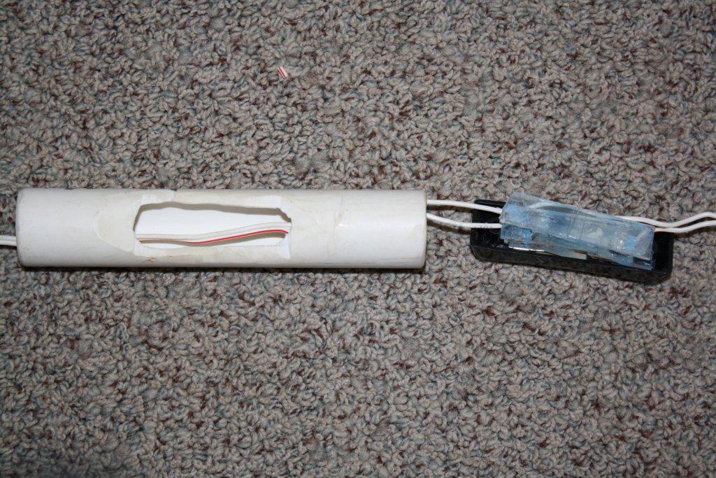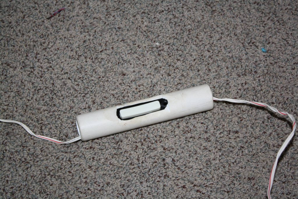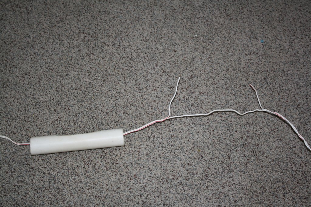 The next step will require tools to make the PVC handles to protect yourself from the copper wires. I used my belt sander to cut the side off the pipe so the door bell switch is hidden in a durable sleeve. A dremel will work just as well. I had to use some scrap acrylic to keep myself from pushing the switch apart inside it. Slide the sleeve over the free end of the wire leaving about six feet out of one end for the burner assembly. Splice the wire as shown in the picture, use the acrylic backing for the switch and slide the switch inside.