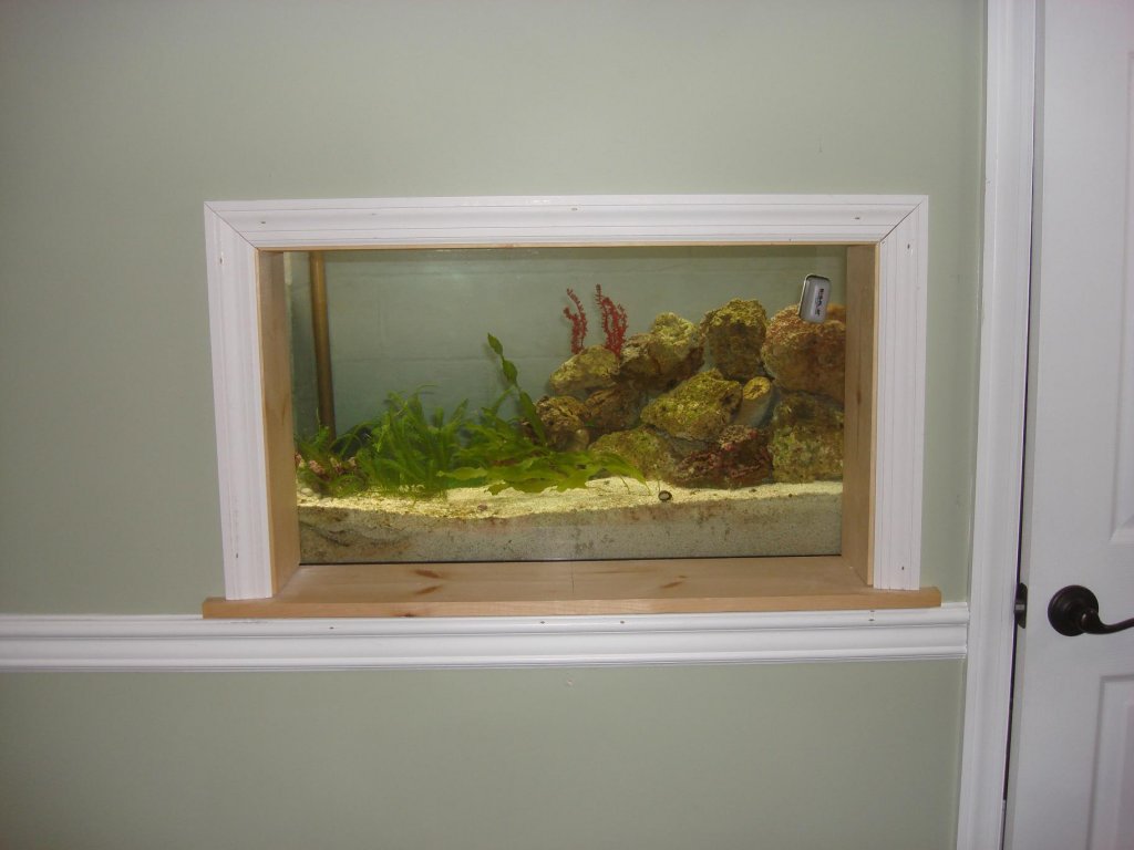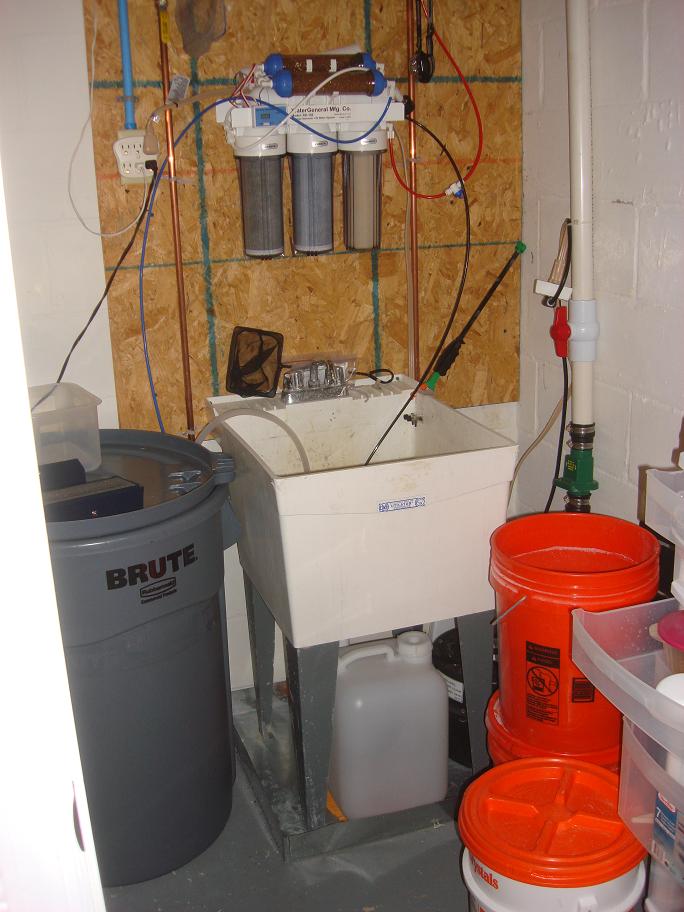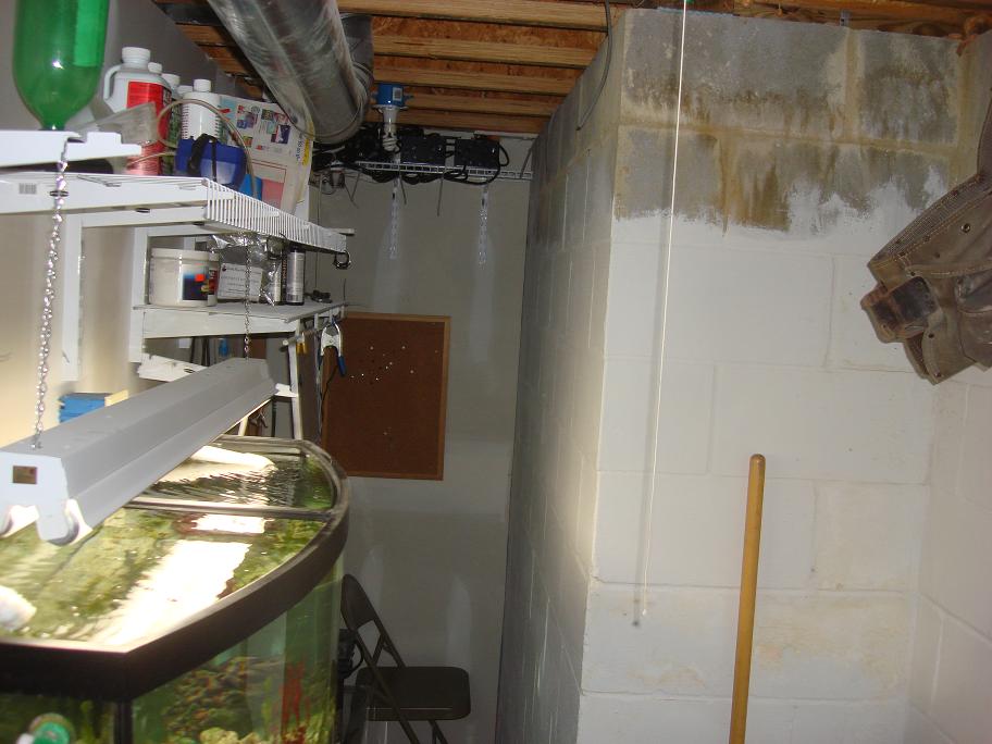 Behind the fish tank is a fish room that houses a sink with R/O unit, sump, a 40 gallon Rubbermaid garbage can for RO water, a 32 gallon Rubbermaid can with saltwater in it (i replace 1-2 gallons everyday, which is very easy with the fish room) and a 72 gallon bow front refuge. I made a display refuge, with a DSB a bunch of live rock and macro algae. The flat back side of the refuge is cut into the wall so you can see in it from my office. You can not see the whole tank only the center portion. One day I plan on putting Sea Horses or something in there. I drilled a one inch bulkhead into the side of the tank and that is how it is plumbed into the sump.