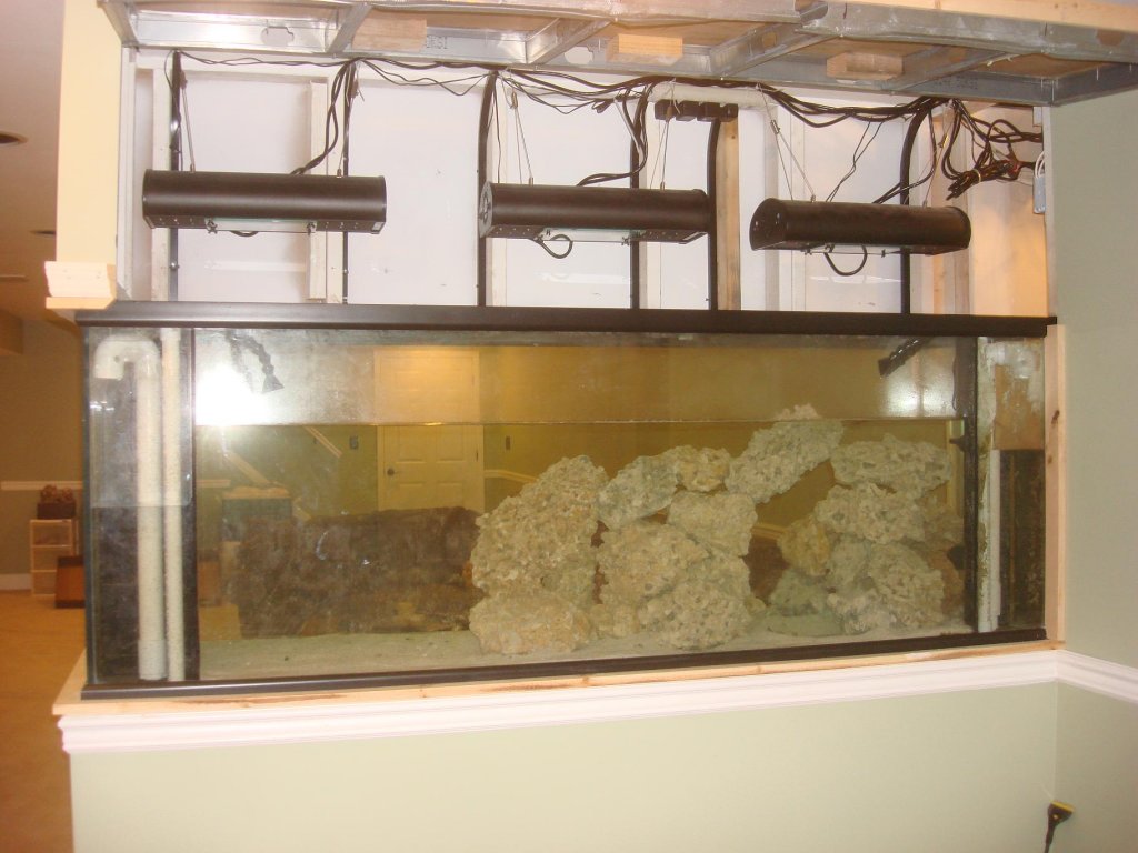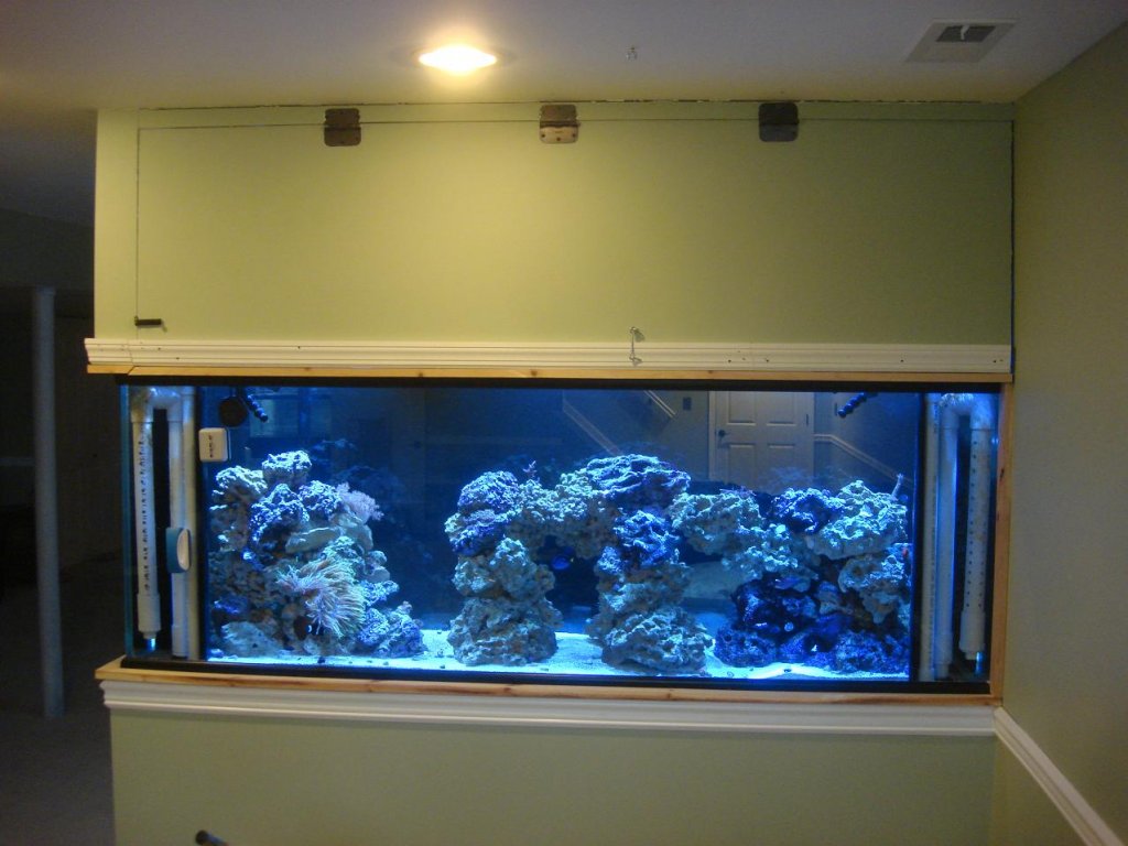Lighting is currently handled by two 250 watt 14k metal halide bulbs. I have the equipment (no bulbs) to setup VHO actnic lighting but currently I like the look of the tank. The lights are on standard timers that come on around 12:30 pm and go off around 10 pm. The timers are off a little so once in awhile I have to reset the times because I will notice the lights turning off around 9pm but they are cheap timers so I really can not complain. All around the tank is Sheetrock so I made a hatch door with door hinges to get to the lighting and over the tank.