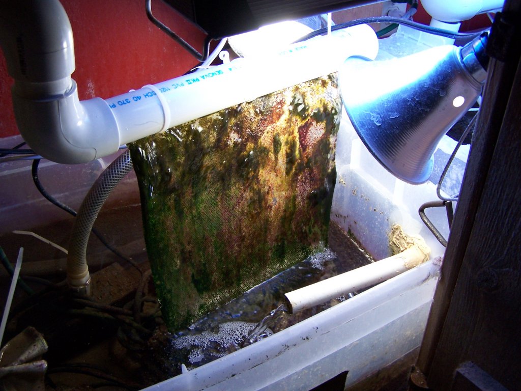 My next plan of attack was to look at my home made filtration system and determine if I could make some improvements. I came across some articles about Algae Scrubbers that seemed very interesting. They looked really easy to build, and I thought "What have I got to lose?". I purchased the items needed to build it and had it installed in 1 evening. For those of you unfamiliar with an algae scrubber, they are simply a screen or piece of ruffed up plastic that you run water over in your sump. You supply a light source...I used 2 5700k power compact bulbs and reflectors that I bought at Home Depot. As the water and light hit the screen, algae will begin to grow on it. After a few weeks you will have enough algae built up that you will need to scrape it off once a week. The idea is that by getting the algae to grow on this screen, it will compete for nutrients, leaving less for the algae in your tank to consume. I anxiously awaited for something to grow, and low and behold, in about a week I had a nice little algae crop growing. Within 2 weeks I was scraping it off, and have been ever since. I was starting to feel like I was going to beat this menace. Step 3 was a success.
