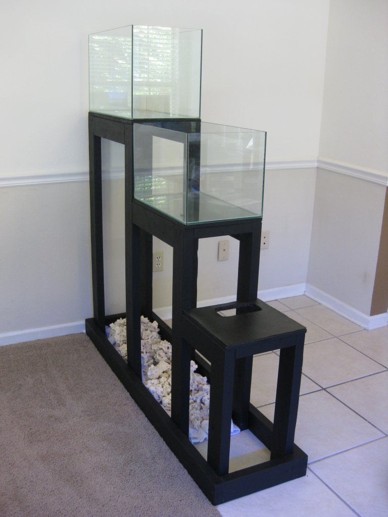 Finally making some progress on the nanos. I finished the stand and have all 3 of the display tanks, but I'm still undecided on the sump. Hopefully I can custom make a 55x9x14 inch 4 section sump, but I haven't ever worked with acrylic before. Maybe I'll get a estimate on a Melev's Reef sump. The stand is made with 2x4's, plywood, and over 80 wood screws. Surprisingly it is very level on all three sections. The holes in the stand are for plumbing.