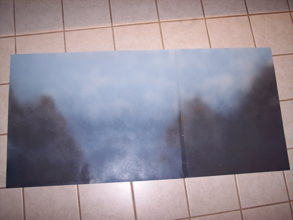 In the meanwhile, I taped together two pieces of poster-board, just to do a test painting to get an idea of what I was doing, and how I wanted it to turn out. This photo is of the posters in a trial painting test run. Then I could tape it inside the frame just to see how it looked behind the frosted blue, to see if it had the look I was going for before I painted the actual back acrylic sheet.