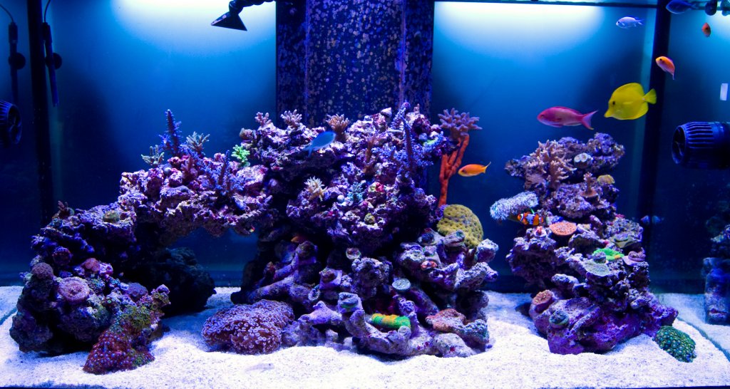 This is a front tank shot from this morning. Lighting is AI Sols Super Blue, I think in this picture the colors are about equal intensity wise. My back lighting is a ShadowBox that is backlit with Ecoxotic white Stunner strips. You can find info all about my ShadowBox project here: http://www.reefaddicts.com/entry.php...Box-Background