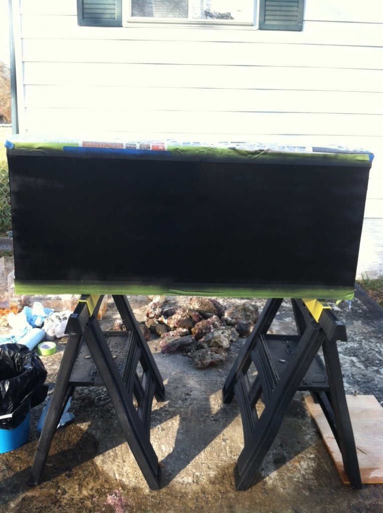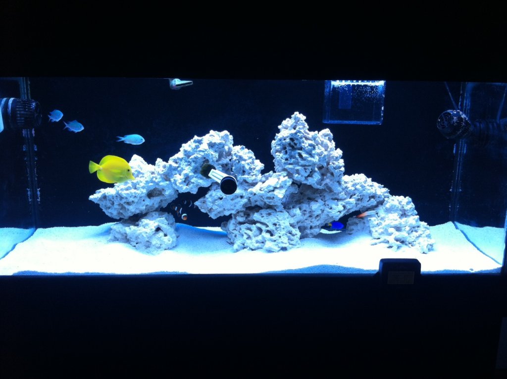 after rinsing the tropic eden reef flake aragonite sand (a step I skipped the first time I set this tank up) I added it to the tank as well as the rinsed MarcoRock and aquascaped. after the temperature and PH had settled into normalcy I was ready to add fish by Sunday (they were very happy) though I have yet to add my entire clean up crew and cleaner shrimp in case of an ammonia spike. I also learned that I needed to get a buch more for my CuC as I found only 4 living reef crabs! Here is the picture I took after adding everything back to the tank still operating under T5's.