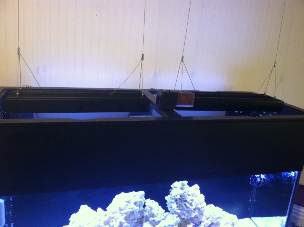 Here is a picture finally of the tank with the LEDs in place and running. This is at about 30-40% brightness and my fish are afraid of the shimmer currently so they will have to get used to that.