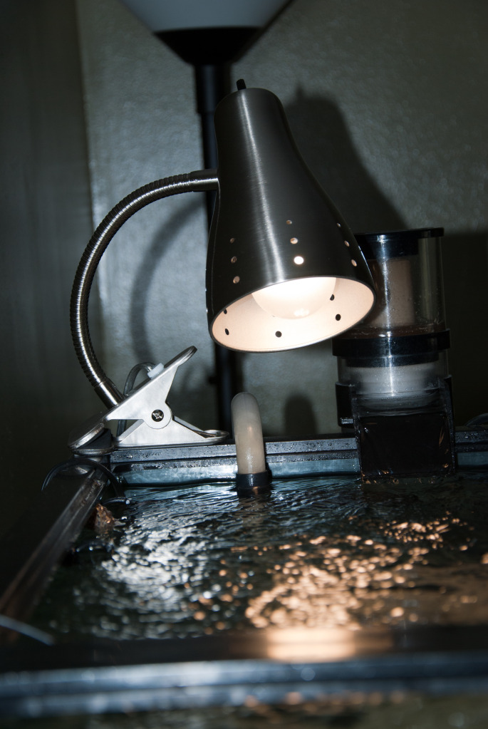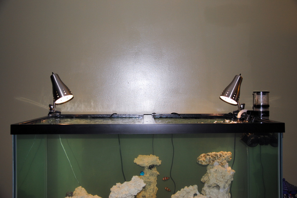 So it has been sometime since I last updated my thread due to work and other non reef related things but the aquarium has been filled with saltwater for about 2 1/2 months with no lights at all. The cycling process has come and gone and I finally got tired of looking at this void tank of water in my living. However, due to cost I am not able to entirely setup my Custom LED Lighting System. So I am not worried about lighting that are able to sustain SPS Corals at this time. May primary concern was to be able to see into the aquarium. I am interested in utilizing Rapid LED Par 38 Bulbs on my aquarium (six or eight bulbs in total) but at the current time I just want to be able to see into the aquarium. So with a little trip to home depot I stumbled across EcoSmart LED Bulbs and Hamilton Bay Clip on Desk Lights. I had been interested in replacing my Compact Flourescent Bulbs in the House with LED Bulbs and figured when I order the Rapid LED Par 38 Bulbs that I could just swap out the Compact Flouresents in my home as to not waste money. I mounted the Hamilton Bay Clip On Desk Lights using Industrial Double Sided Tape and screwed the LED ECO Smart LED Bulbs in and presto we have Light! The bulbs in my opinion are absolutely great. They only utilize 8.5 watts of energy and they don't heat whatsoever. Also they produce the shimmer that we all love. Now I am no lighting expert and I do intend to swap these out for the Rapid LED Par 38 LED Bulbs but I was curious to know if these would sustain corals at the wavelength of light they produce which is 3200K. All in all it was an extremely inexpensive lighting solution for the time being.