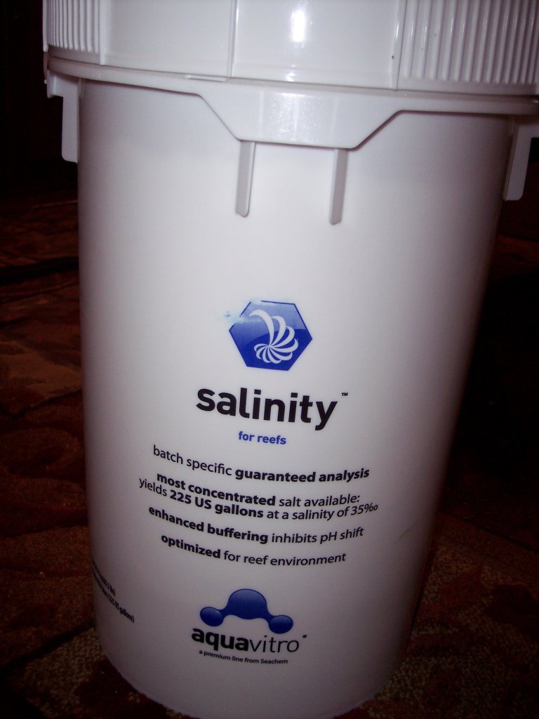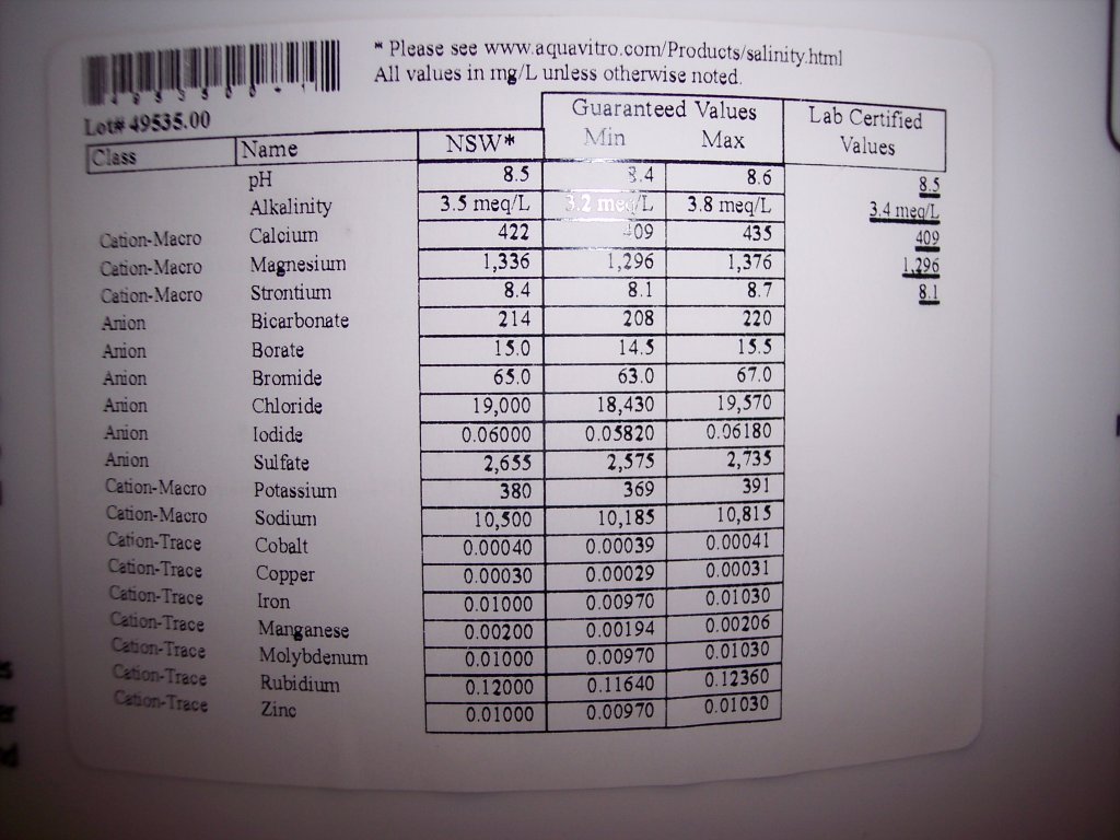 I have decided to abandon the Oceanic Salt that I have been using since my 150g tank has been set up. I have found that the calcium levels are just too high for my tastes. It is staying up at around 460-470ppm, even with my calcium reactor turned down to bare minimum drip and bubble count. Oceanic is known to have high calcium levels, so to bring it down I am switching to a new salt that has come onto the market in the last year. It is Seachems AquaVitro Salinity. The unique thing about their salt is that they test the parameters of every batch and print them right on the back label of the bucket. You can see the label in the pictures. I will report back after I do my first water change with the new salt.